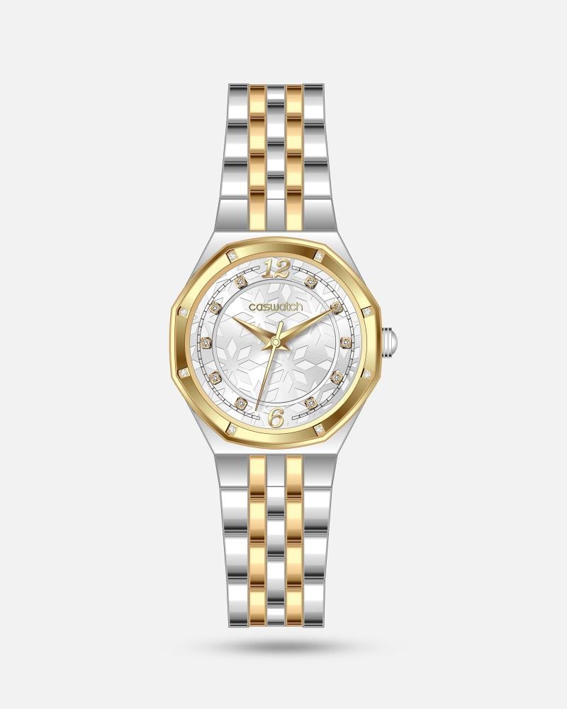 وإطلالة لا تُنسى! ساعة "أصل الفخامة" بتصميمها الستيل الفضي والذهبي اللامع، ومينائها الابيض المُرصَّع بفصوص زركون البراقة،