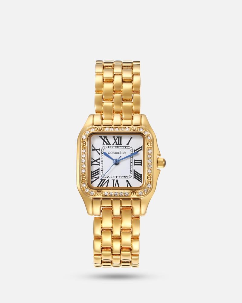 ساعة نسائية ذهبية أنيقة مربعة شبيهة كارتير ومزينة بفصوص