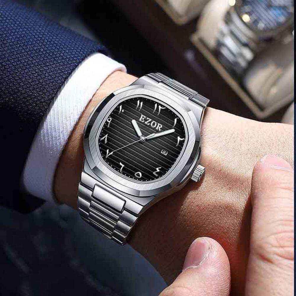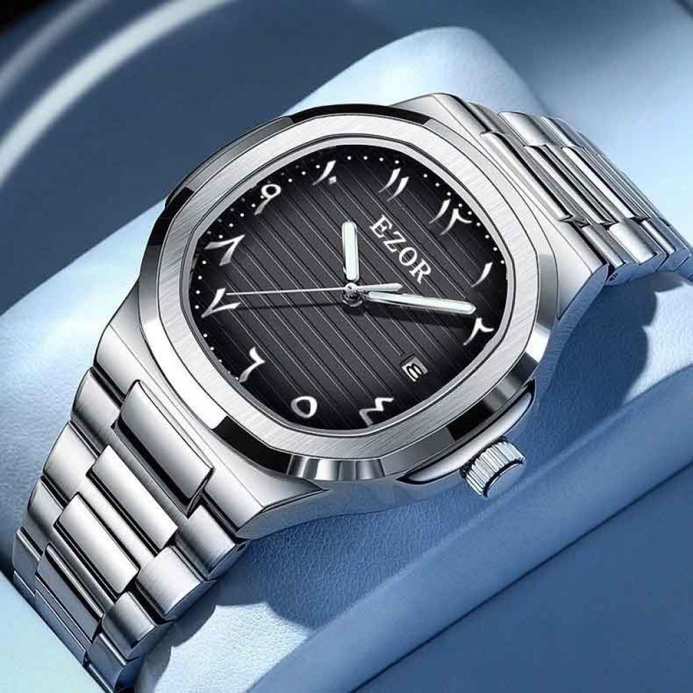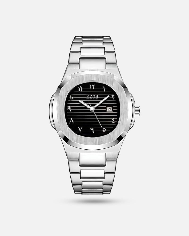 ساعة رجالي فضية ميناء أسود بأرقام عربية – أناقة تعكس ذوقك ارتقِ بإطلالتك مع ساعة رجالية فاخرة بلون فضي أنيق،