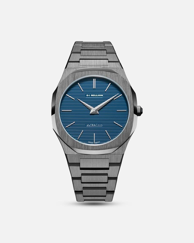 ساعة D1 MILLION الرجالية باللون الرمادي تتميز بتصميمها العصري والأنيق، حيث تأتي بإطار معدني رمادي اللون مع قرص ساعة دائري أزرق اللون مع إشارات و عقارب فضية اللون.