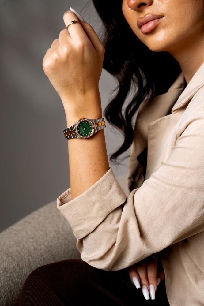 💎 هذه الساعة الذهبية والفضية ذات الميناء الأخضر المُرصَّع بفصوص الزركون ليست مجرد ساعة، بل تحفة فنية تَحمِل طابعَ الجرأة والأناقة