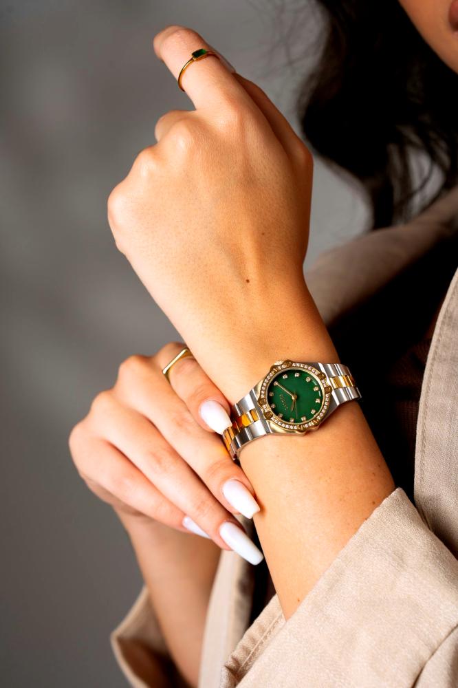 - "هذه الساعة بيانُ أناقتكِ... ذهبٌ يلتقي بفضةٍ في إطارٍ أخضر يُحيط بكل ثانية من حياتكِ بلمسة ملكية!"