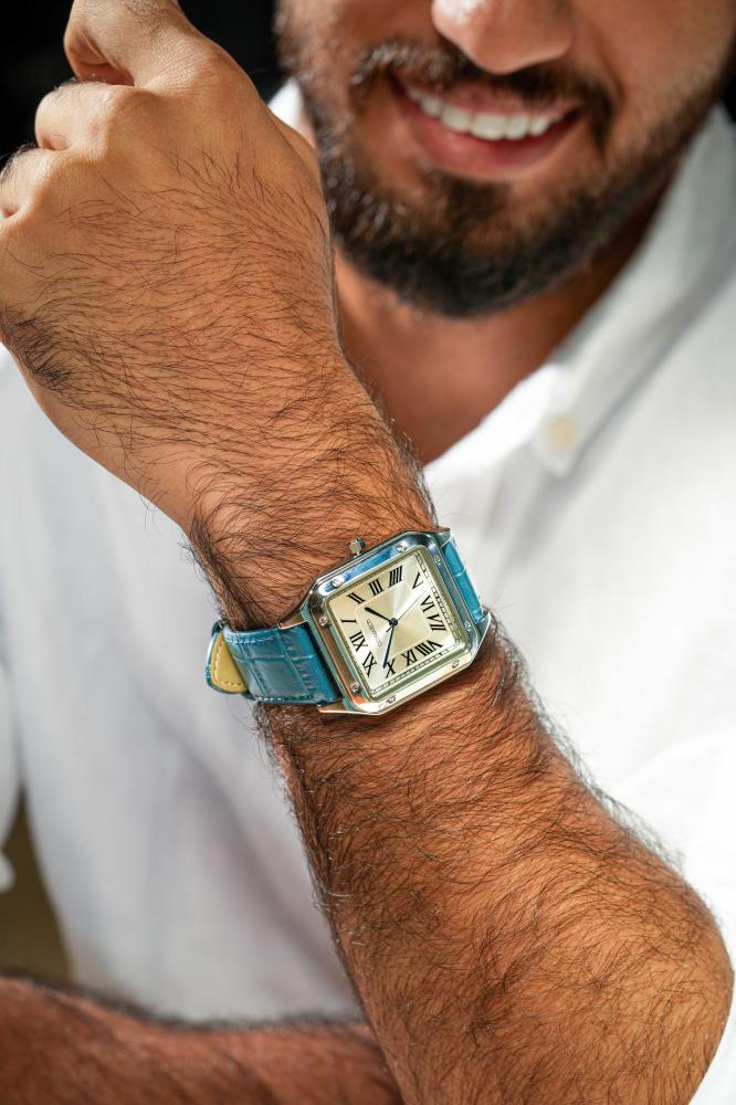 هل تبحث عن ساعة شبيهة كارتير أنيقة وعصرية تضفي لمسة جذابة على مظهرك؟ احصل الحين على ساعة الجلد المربعة بلون أزرق هي الخيار المثالي لك.احصل على هذه الساعه اليوم واضفها الى مجموعتك الرائعة من الاكسسوارات، واستمتع بإطلالة عصرية وأنيقة في نفس الوقت.