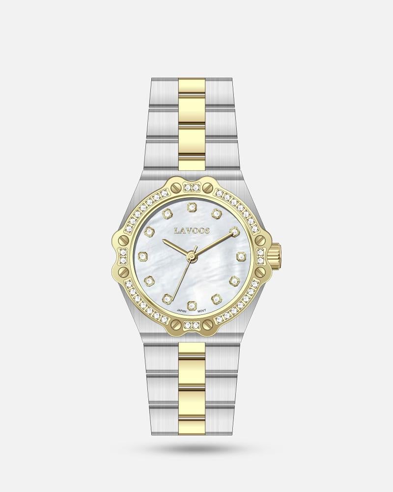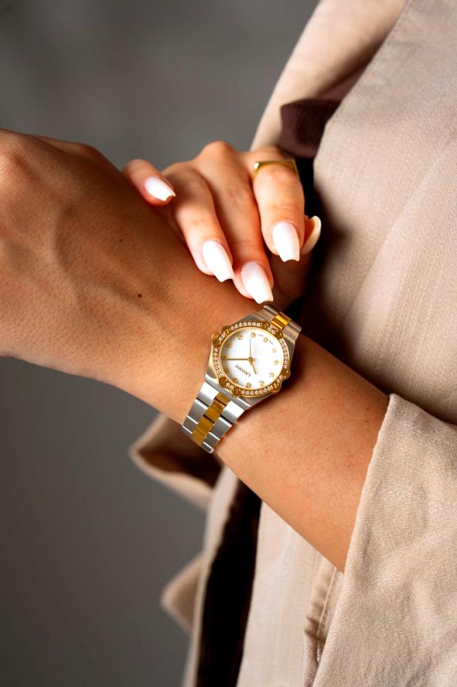 💎 هذه الساعة الذهبية والفضية ذات الميناء الأبيض المُرصَّع بفصوص الزركون ليست مجرد ساعة، بل تحفة فنية تَحمِل طابعَ الأناقة والجمال