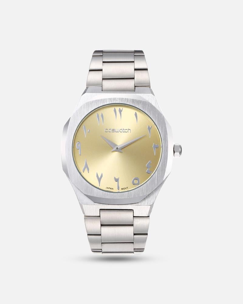 ساعة رجالية نحيفة وعملية بتصميم أنيق، حيث يأتي الهيكل والحزام بلون فضي لامع، بينما يتميز ميناء الساعة بلون أصفر يضفي لمسة من الحيوية.