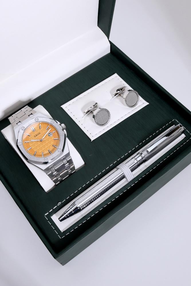 محتويات الطقم :ساعة رجالية مقاس 41 ملمكبكقلمعلبة وكيس ورقي مجانيضمان ع الساعه سنة كاملة يشمل دخول الماء والمكينة
