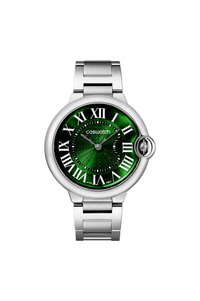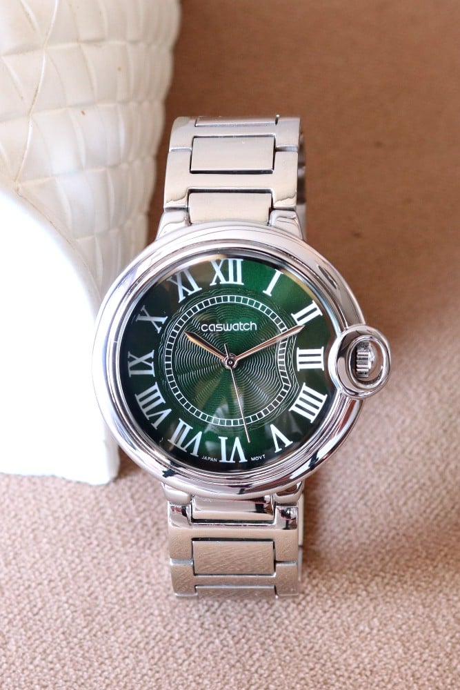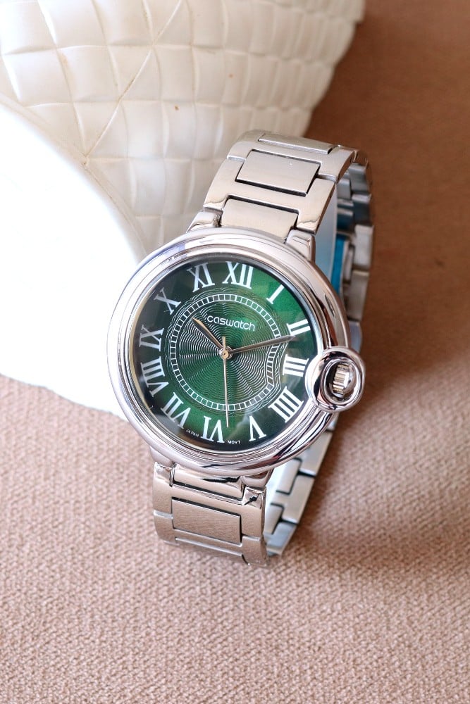 احصل الآن على افضل ماركة للساعات ساعة كاسواتش الرجالية باللون الفضي مستوحاة من تصميم كارتير، تحتوي على ميناء أخضر جذاب مع قرص ساعة معدني يظهر الوقت بوضوح، كما أن عقاربها الفضية توضح الساعات والدقائق والثواني بتفصيل دقيق، كما أن أزرار التحكم الجانبية الثلاث تمكنك من تغيير توقيت الساعة بسهولة، تم تصميم هذه الساعة بأدق التفاصيل لتلبي توقعات الرجال الذين يبحثون عن نمط حياة يتضمن المزيج المثالي بين الأناقة والوظائف العملية المطلوبة.
