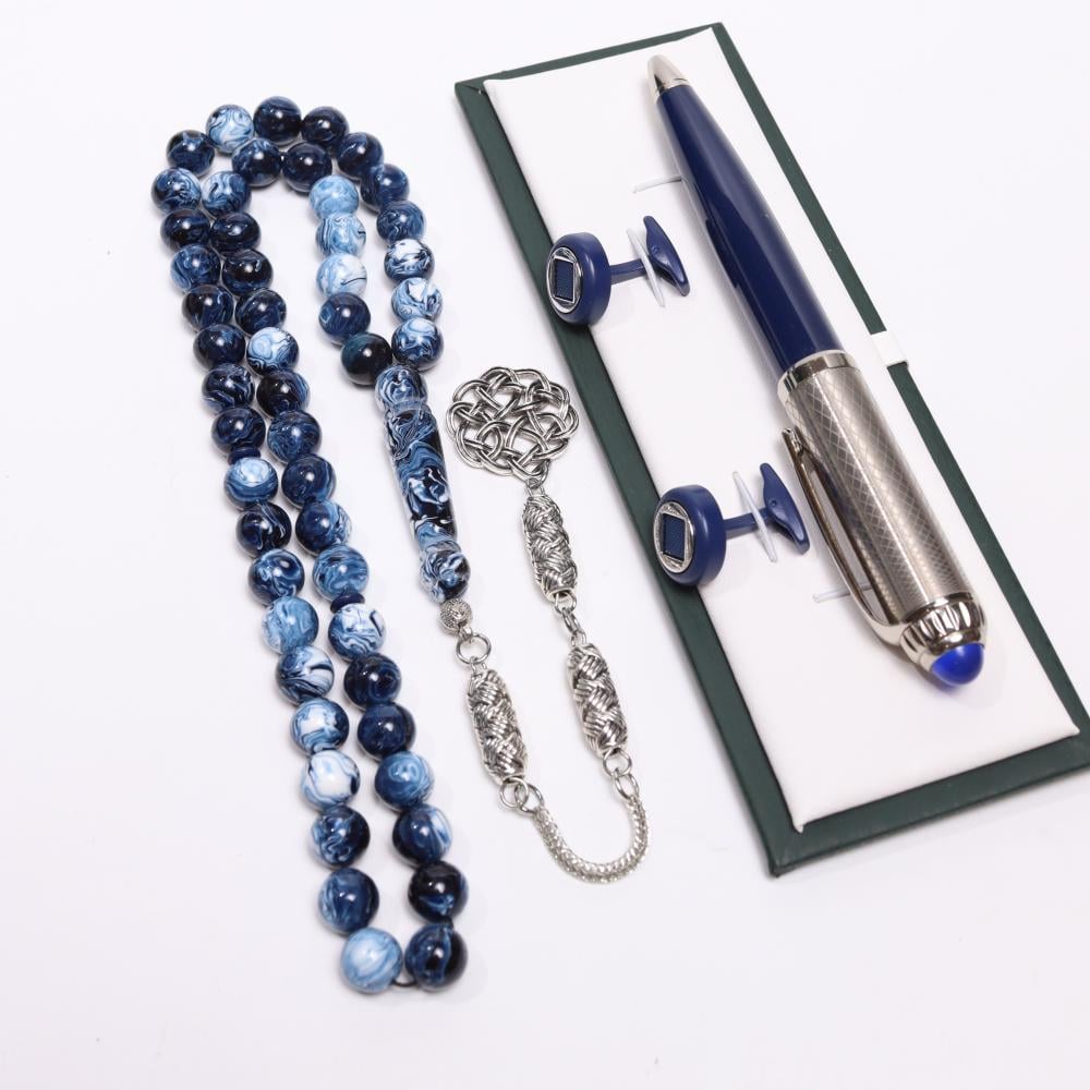 طقم أنيق يجمع بين قلم معدني أنيق، مسباح فاخر بلون كحلي مخلوط (51 خرزة)، وكبك معدني فضي خفيف الوزن.