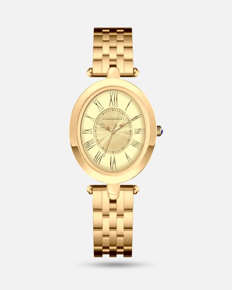 تحكي الساعة جوهر الفخامة الملكية، حيث يلتقي الباند والكيس المصنوعان من المعدن بلمعانهما الدافئ. تصميمها البيضاوي المترف،