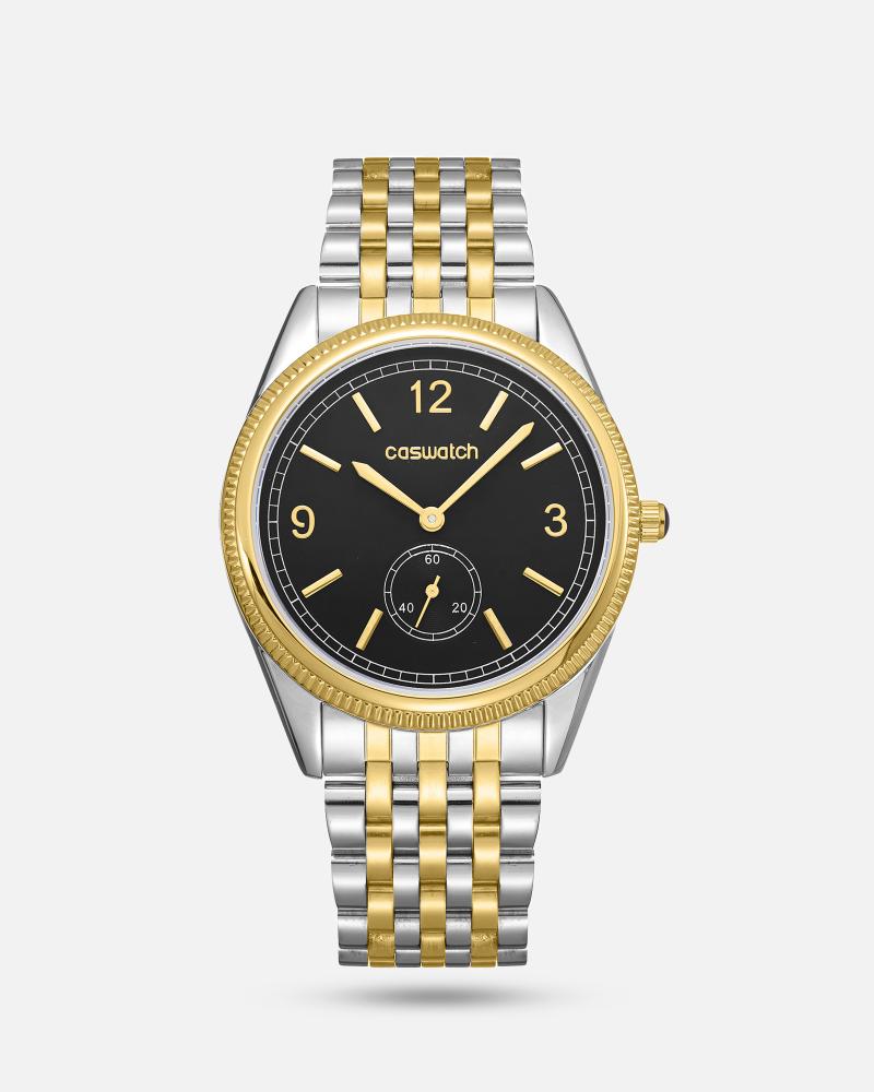 ساعة النخبة الرجالية ستيل بلون ذهبي وفضي ميناء أسود
