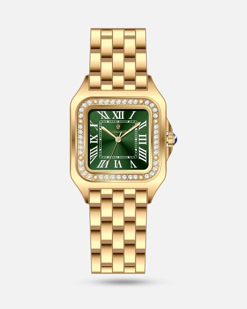 ساعة نسائية فاخرة بسير ستيل ذهبي ميناء أخضر ✨ هدية تخطف الأنفاس!