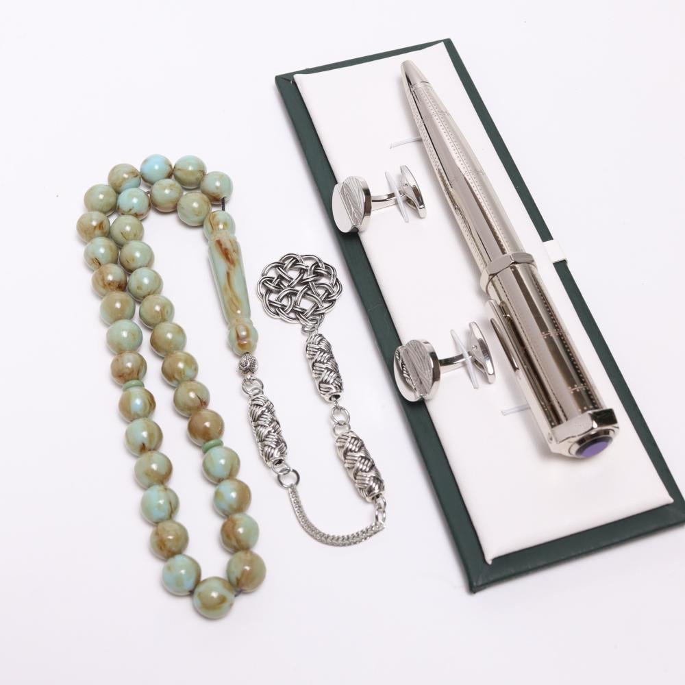 طقم أنيق يجمع بين قلم معدني أنيق، مسباح فاخر بلون تركواز مخلوط (33 خرزة)، وكبك معدني فضي خفيف الوزن.