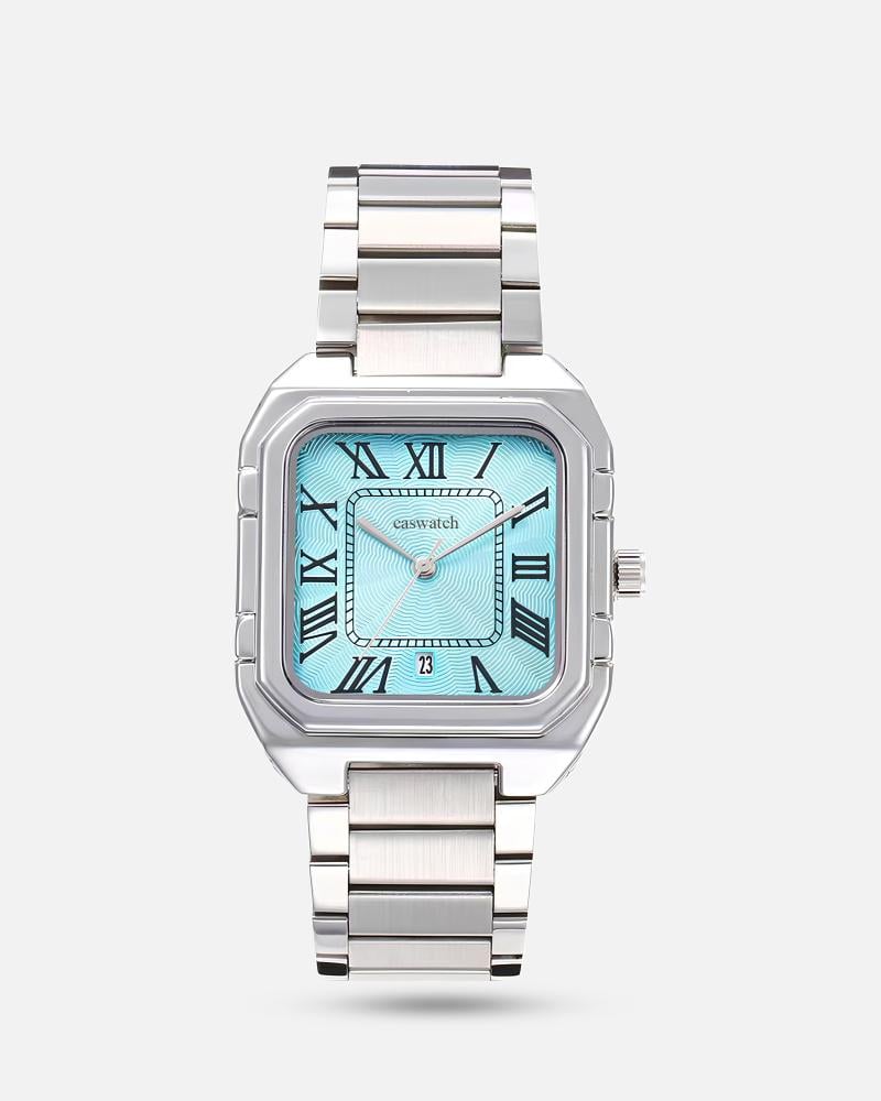 ساعة رجالية من الستيل الفاخر، بمينا مربّع يحمل أرقامًا رومانية أنيقة، كأنها تعيد الزمن إلى صفحاته الخالدة. صُنعت من الستيل لتكون رمز قوة وثبات، وكأنها تجسد في تفاصيلها صلابة وطن لا ينحني، وأناقة رجل يقدّر قيمة اللحظة. تصميم يجمع بين الفخامة الكلاسيكية وروح الانتماء العميق