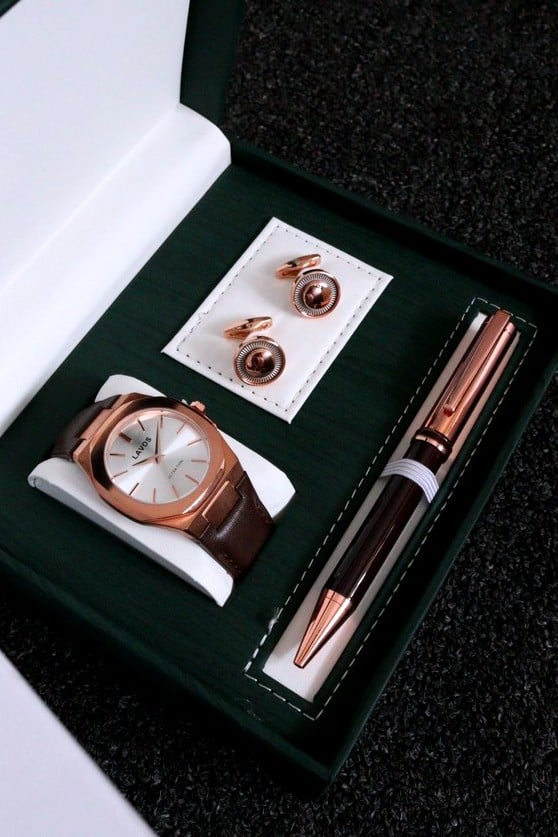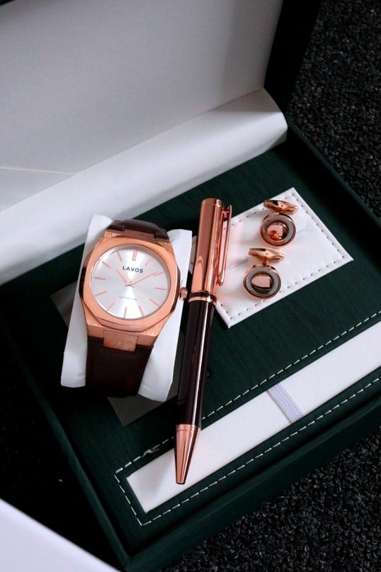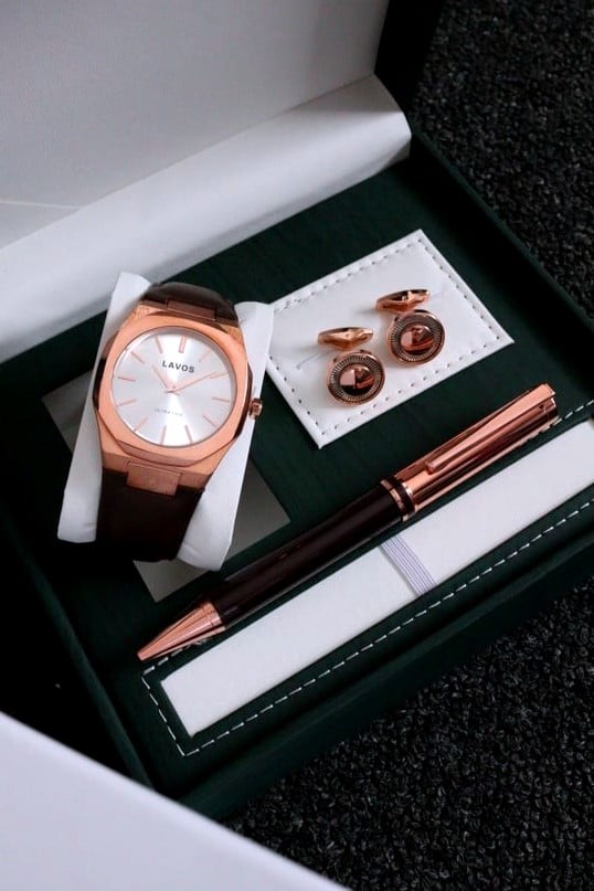 طقم رجالي رائع يضم ساعة رجالية أنيقة وأصلية مقاومة للماء مع ضمان لمدة سنة كاملة. الطقم يأتي مع قلم وكبك متناسقين مع التصميم العصري للساعة. يأتي الطقم مع تغليف فاخر وجذاب مما يجعله هدية مثالية لمن تحب.