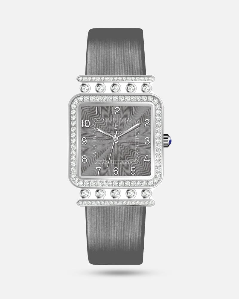 ساعة نسائية جلد رمادي مرصعة بكريستال فضي | ضد الماء | ضمان 3 سنوات | هدية فاخرة - أصل الفخامة