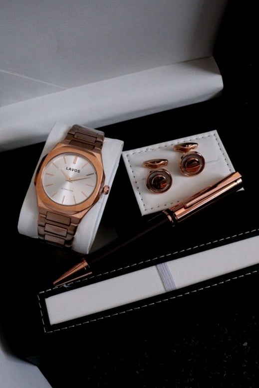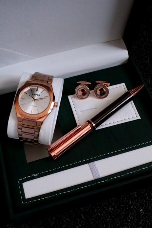 اشتري الحين طقم ساعه مع كبك وقلم مكون من ساعة بتصميم أنيق وعصري باللون الروز قولد مع ميناء أبيض يضيف لمسة من الأناقة والرقي إلى مظهرك. يأتي الطقم متناسقا مع كبك وقلم بنفس التصميم ليكملوا إطلالتك بأناقة لا مثيل لها.احصل على هذا الطقم الرجالي الراقي اليوم وامنح نفسك أو شخص آخر هدية تميزه أينما حل وارتحل.
