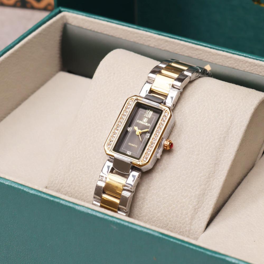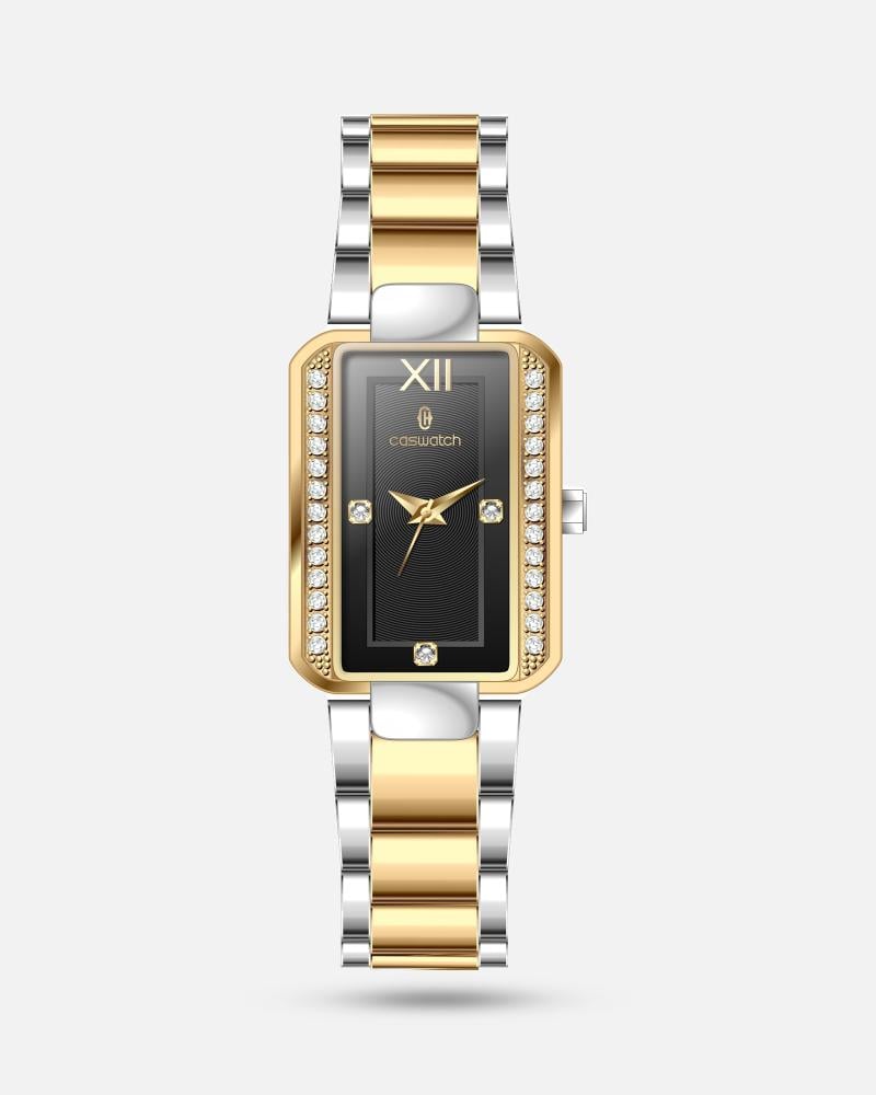 ساعة نسائية مستطيلة بسير ستيل باللون الفضي والذهبي ميناء أسود