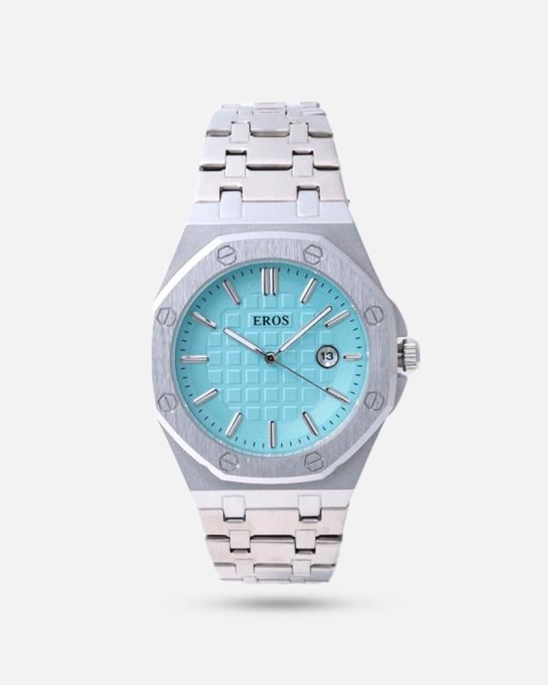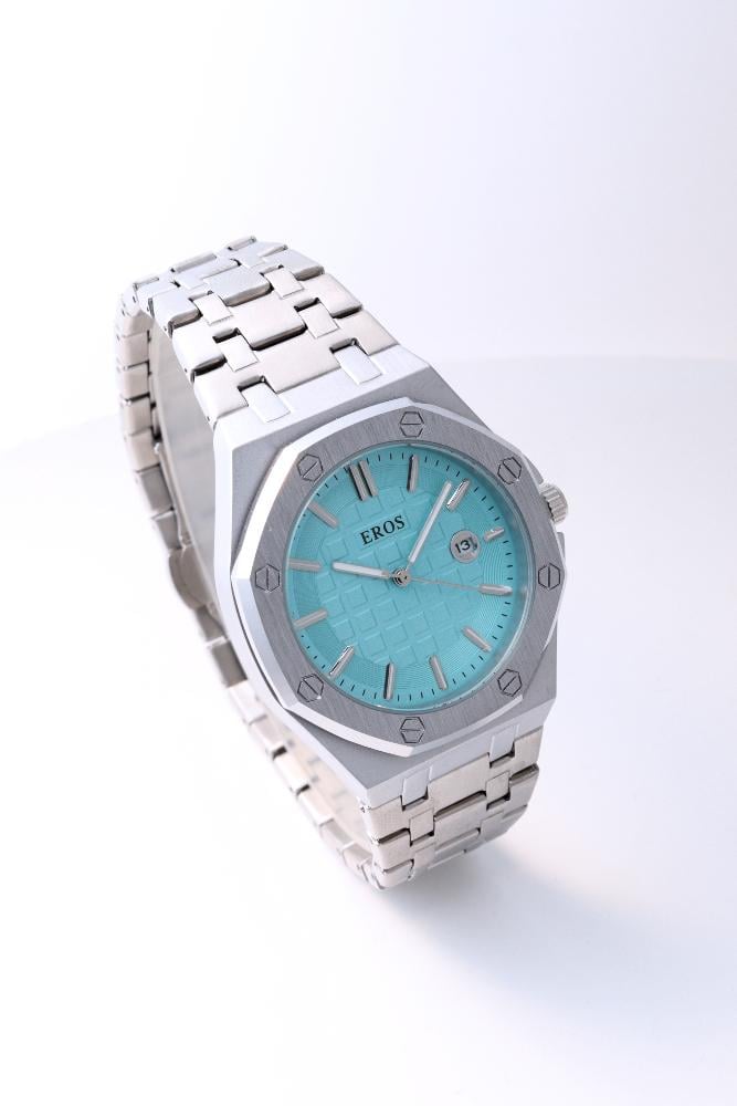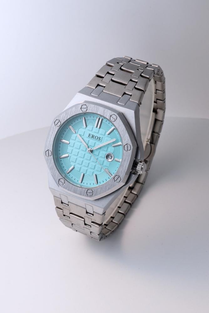 - اسم المنتج : ساعة رجالية باللون الفضي والسماوي AP15