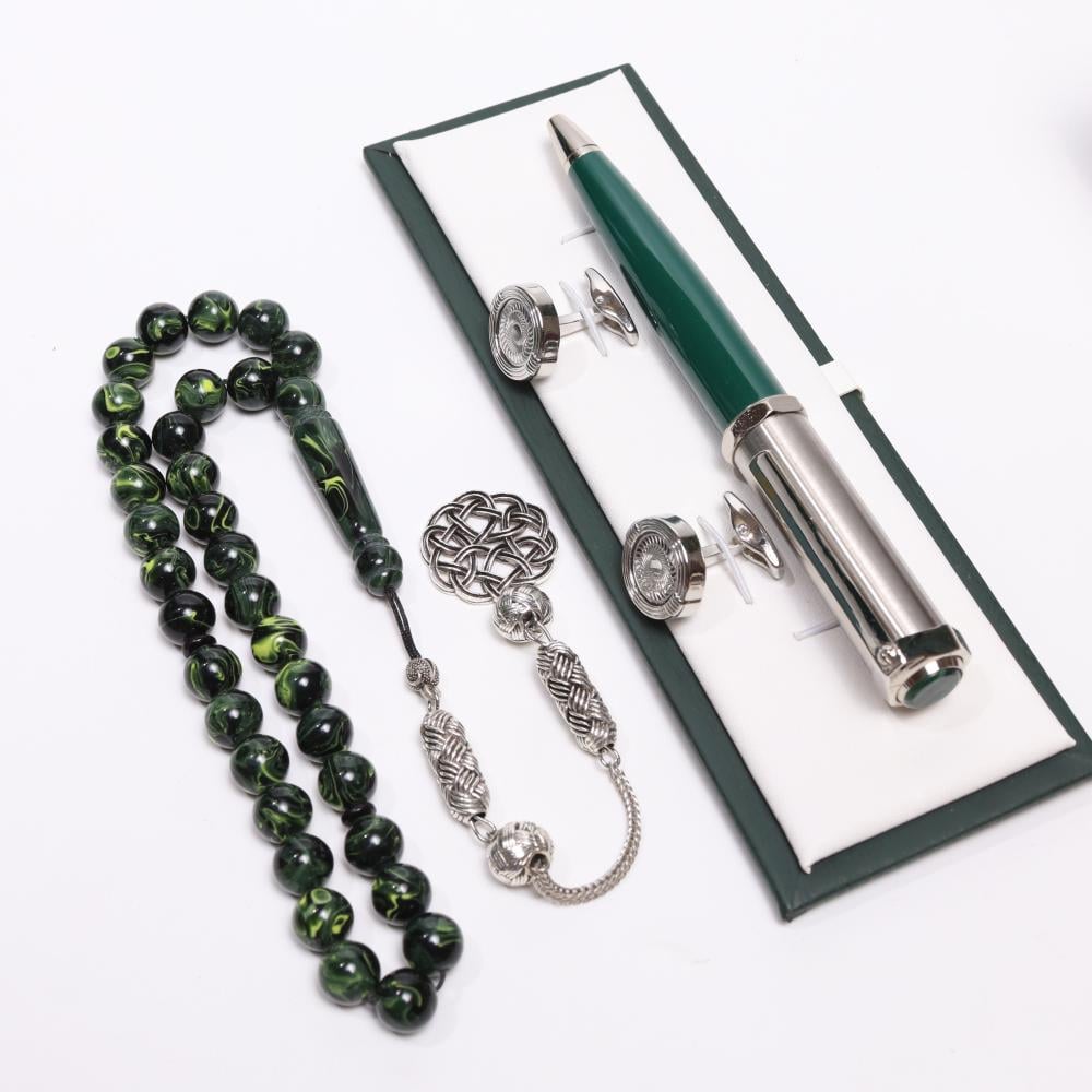 طقم أنيق يجمع بين قلم معدني أنيق، مسباح فاخر بلون أخضر مخلوط (33 خرزة)، وكبك معدني فضي خفيف الوزن.